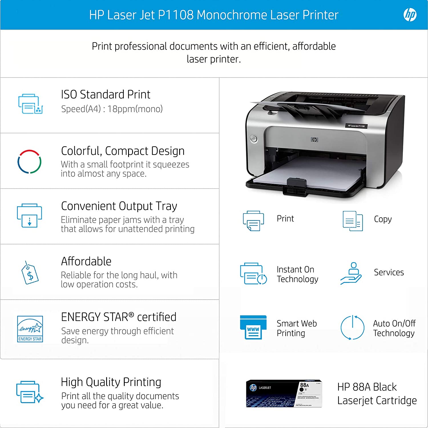 - Printer Type – LaserJet ; Functionality – Single Function (Print Only); Printer Output – Black & White only
